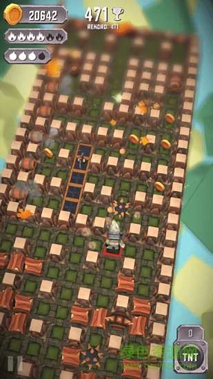 游戏采用无尽模式进行,你身后的场景会自动进行塌陷,给玩家带来了一定的紧迫感,需要不断向前炸出一条血路才能避免不掉落下去,不过当你被自己的炸弹炸到,或者被敌人碰到都会直接造成GAMEOVER,所以在放置炸弹时一定要考虑好自己的位置才行。划动屏幕即可让角色进行移动,双击屏幕就能在当前位置上放置炸弹,此外,玩家还可以通过拾取道具来增加放置炸弹的数量和威力。