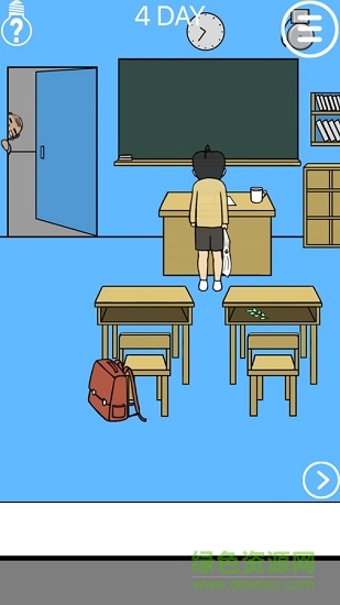 第四关引入了动物互动机制。玩家需要先在抽屉里找到一根小树枝,然后到右侧场景将树枝送给可爱的小猫咪。作为回报,猫咪会抓来一只老鼠。将老鼠放置在教室门附近,等老师被吓跑后,主角就能大摇大摆地离开教室了。