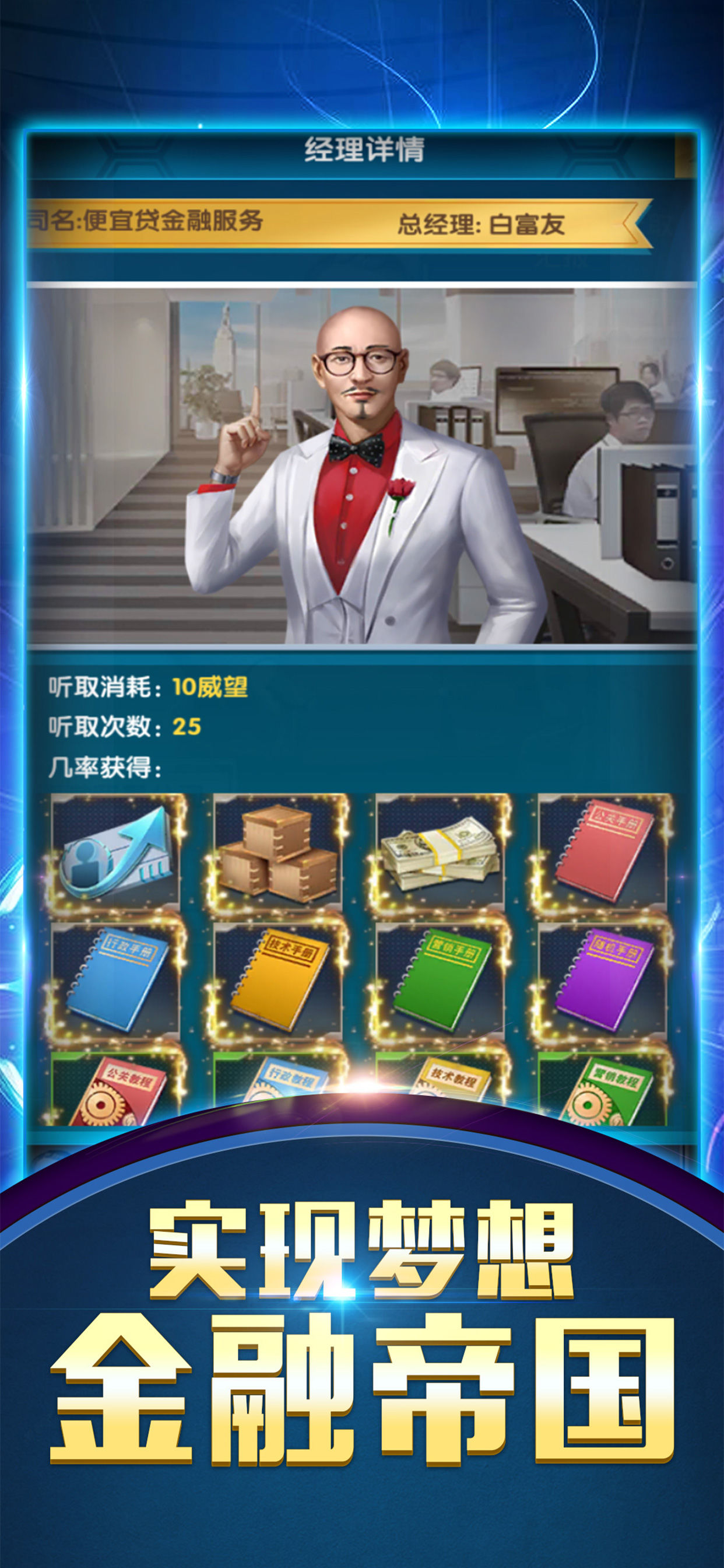 在这里,你可以一步步收购品牌公司,招揽上层精英员工,一起打造属于你的商业帝国!
