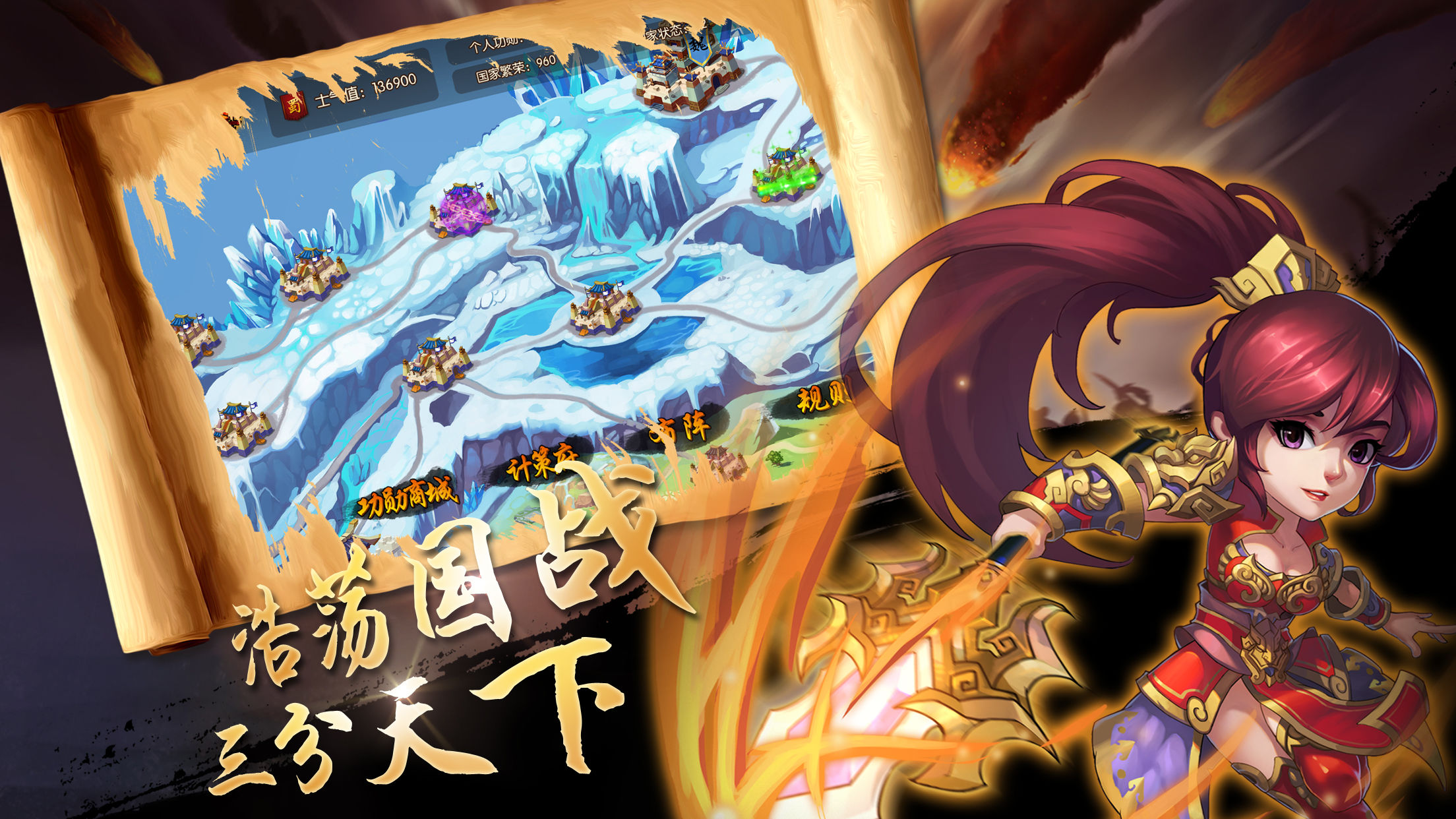 4.国战:以国家为单位,三个国家间进行的国与国之间的战斗。需要玩家间相互配合,辅以对应策略战术。