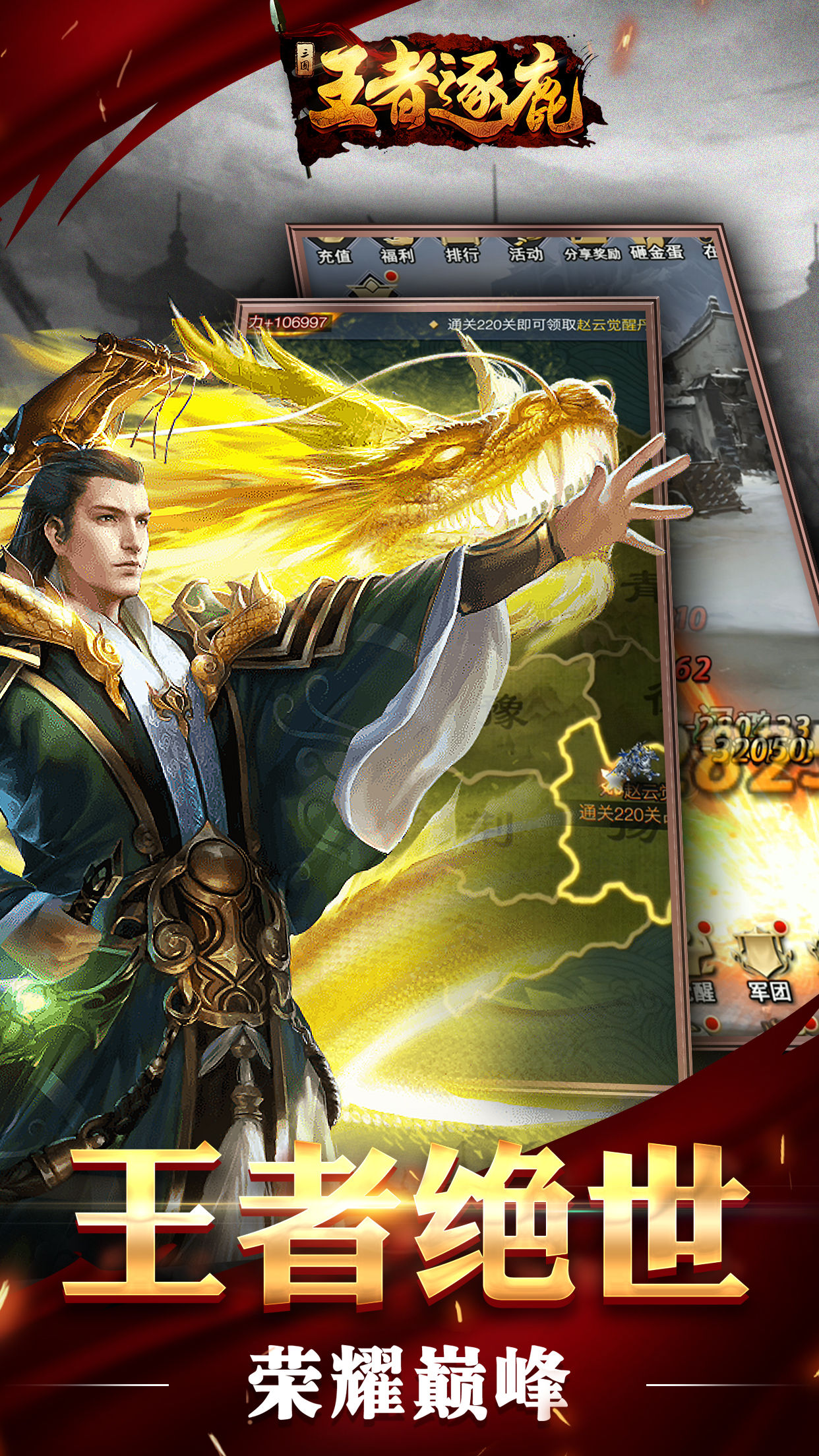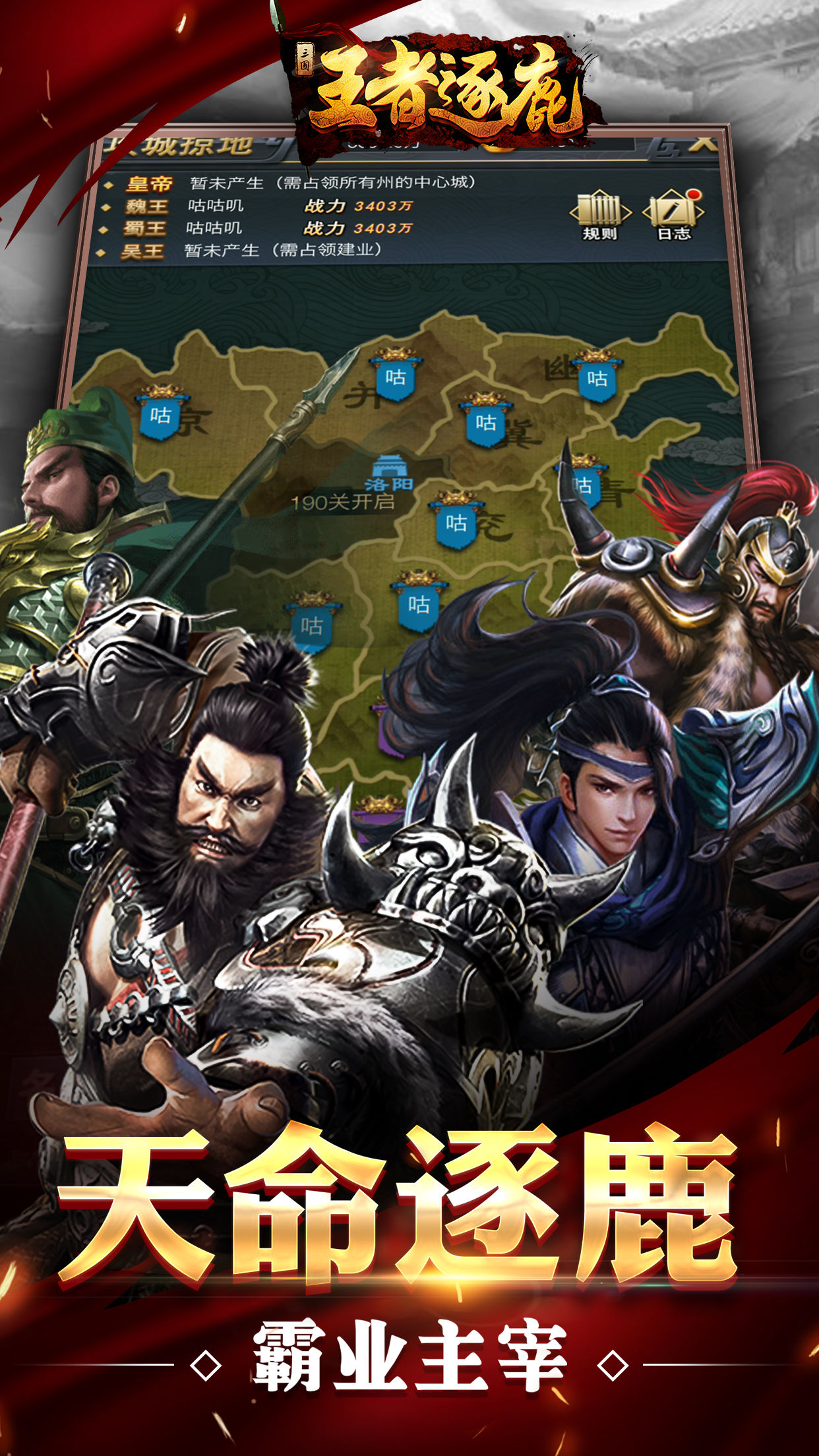 《王者逐鹿》是一款融攻防战争与策略卡牌为一体的三国类竞技游戏。千倾江山,万里狼烟,数骑枭雄武魂现,闲时青梅煮酒,招将麾下,乱时雄狮披甲,列阵御前;铜雀巍峨入云,立塔遥望千关,挥戈盘龙争霸主,风云变幻铸英才;更有天梯万斩,一骑当千,群雄逐鹿成末世,百伐竞技统河山;荣耀问鼎,逐鹿中原,且看王者乱世建功勋,拜武官上将,血战操戈,辉耀九天!