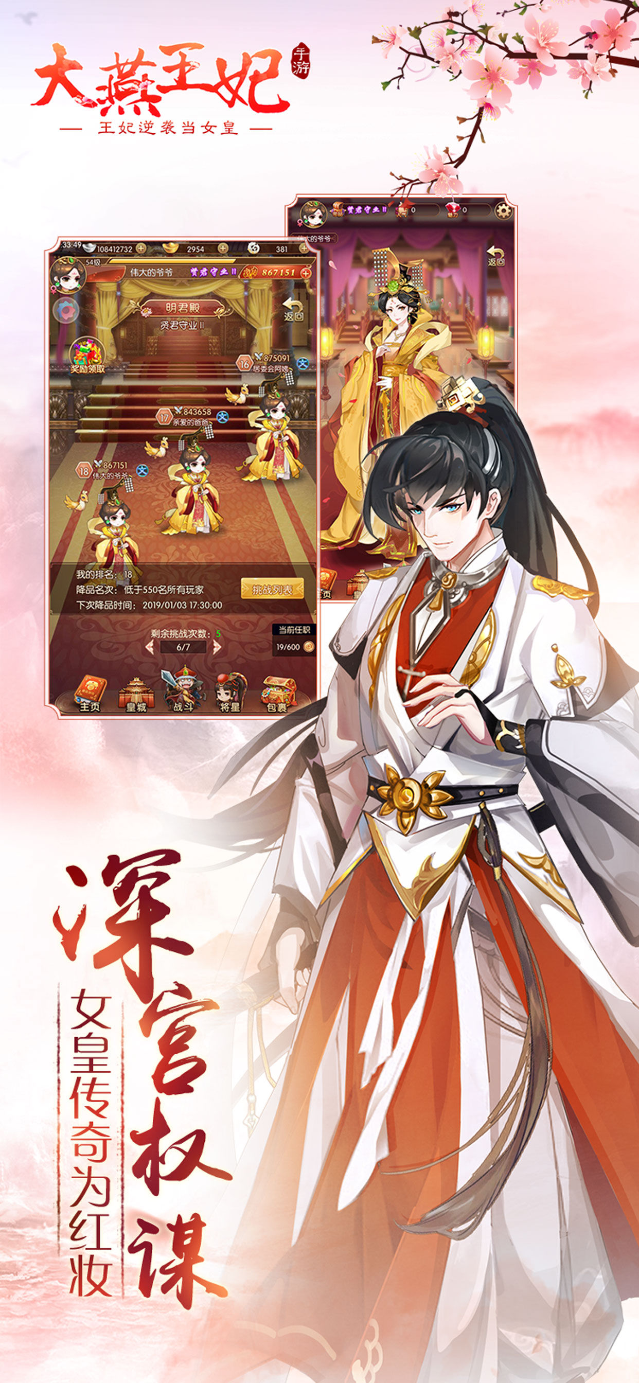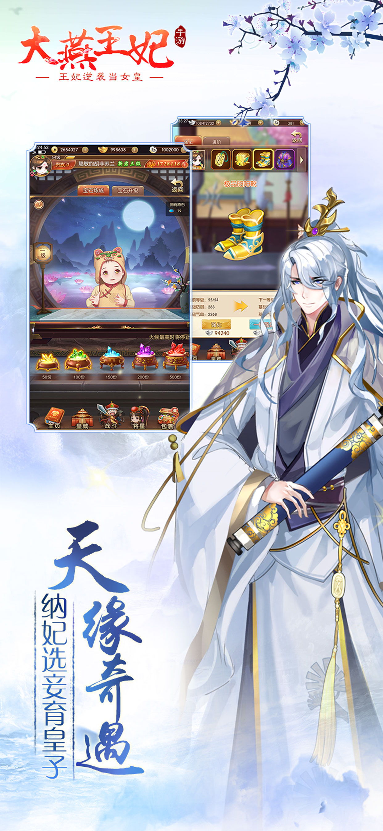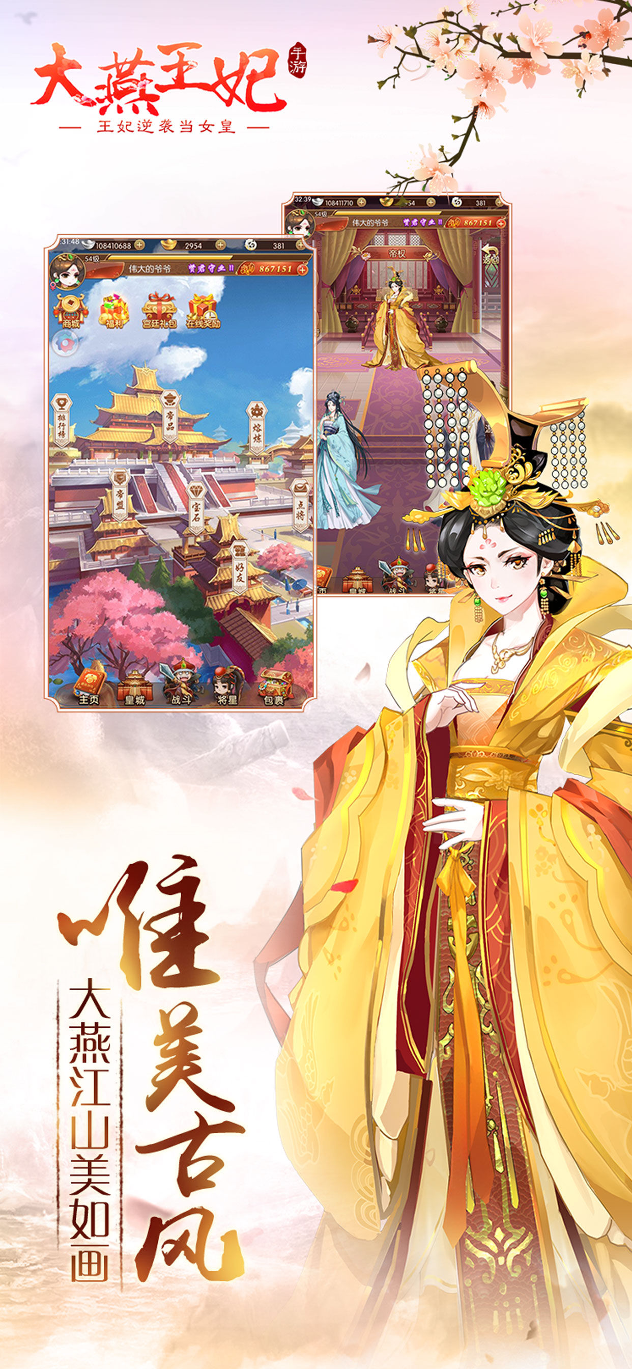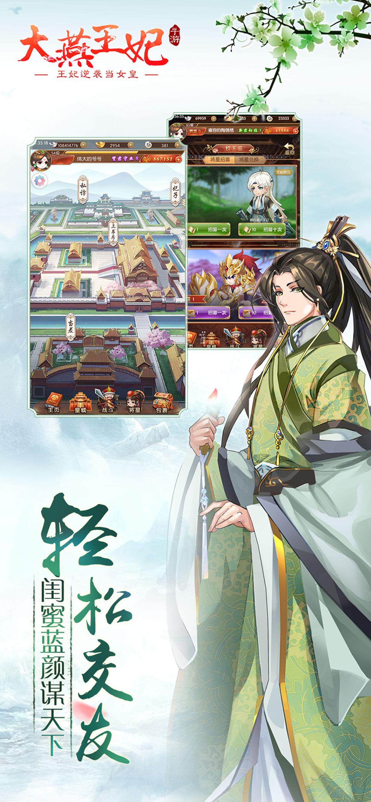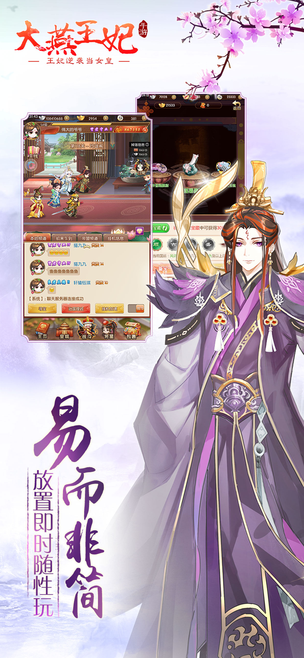 《大燕王妃》手游是根据阅文集团旗下著名作家郡主所著的同名宫廷言情小说改编,由趣奇游戏开发、阅文集团和趣奇游戏联合发行的一款宫廷交友养成手游。精美的新古风画面、跌宕起伏的故事剧情,让玩家置身真实浪漫的大燕王朝。简单而不失乐趣的放置玩法,轻松愉悦的交友氛围,在满足女性玩家随时随地开启朝代生涯的同时,还能邂逅“古风小哥”,享受激萌“云养娃”,续写一段惊心动魄而又温馨浪漫的女皇传奇!