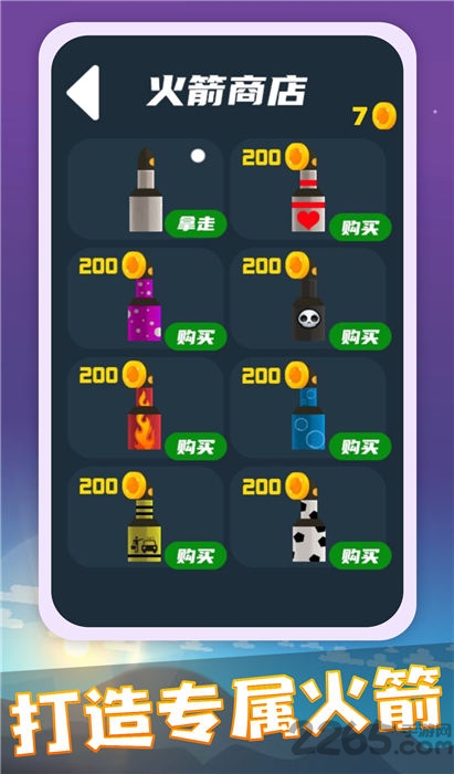 游戏中在火箭商店中去购买各种设备道具,独特的建造过程中,让火箭燃料充足;完善的升级系统让玩家可以持续强化飞船性能。