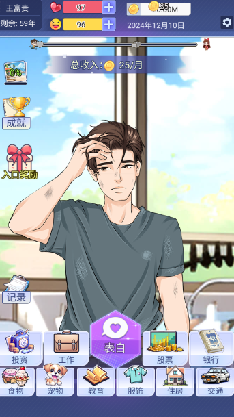 点击表白按钮,当积累足够的财富和好感度后,就可以向心仪的女孩表白。游戏设置了多种浪漫表白场景,玩家需要通过快速点击来增加表白成功率,最终赢得美人归。