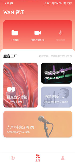 3、在上传中有着上传音乐、提取视频配乐、录制音频、百变音乐滤镜、语音去噪、音乐编辑等功能: