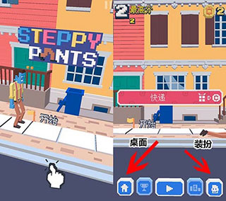 4、我们在进入长腿漫步后,就会直接开始一轮游戏,我们可以直接结束或者先挑战一波直到本局结束,下面就会出现菜单栏,最左边的是游戏桌面,右边是装扮。