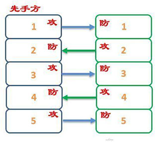 后1攻,先1防→先2攻,后2防→后3攻,先3防→先4攻,后4防→后5攻,先5防