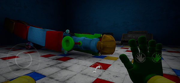 醒来出现在一个陌生的世界,这里有很多玩具,左下角按钮可以操纵角色自由移动,右侧代表左右手掌,便于拾取物品,目前只能使用绿色手掌。