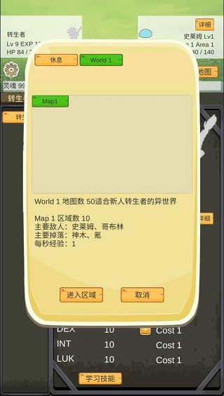 拥有转生者后,你可以通过屏幕左下方的侧栏查看他们的能力,然后将他们派遣到异世界。点击屏幕右下角的“选择地图”按钮,之后选择World1和Map1。