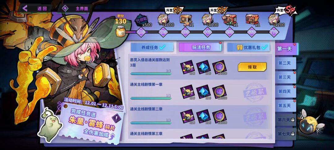 【七日目标】开服每日开启一系列的任务,完成对应任务可获得SR朱童·雾蜂碎片以及海量养成资源,最终会将保送到SP品质!朱童·雾蜂作为游戏中为数不多的辅助角色,属于新手必入啦!不可错过!