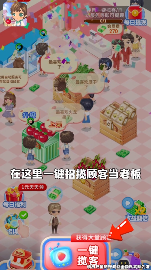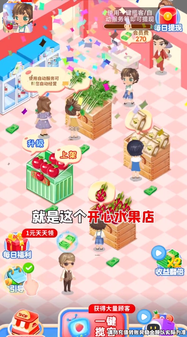 开心水果店红包版是一款非常靠谱的模拟经营游戏,游戏场景精美,玩法新颖有趣。玩家将扮演一位水果店店长,负责店铺的日常运营,包括进货、摆放水果、接待顾客等。游戏提供了丰富的经营策略,你可以根据市场情况制定合适的销售方案,吸引更多顾客。此外,游戏还设有社交功能,邀请好友一起加入可以获得额外分红奖励。游戏收益稳定,提现方便快捷,是一款既能娱乐又能赚钱的优质手游。