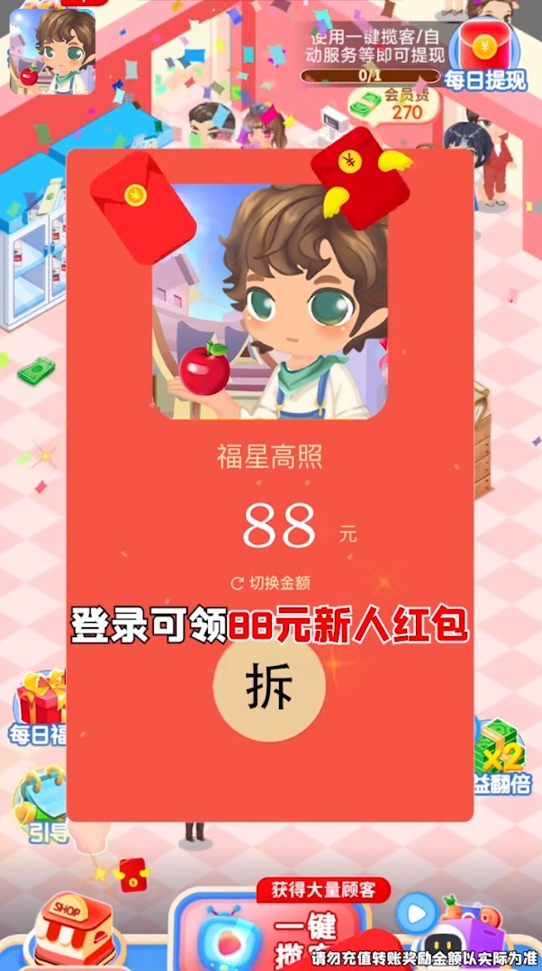 开心水果店的提现流程非常简单便捷。通过日常经营店铺赚取的收益会自动累积到你的账户中,无需繁琐的操作就能实现自动到账。系统支持多种提现方式,包括微信、支付宝等主流支付平台,提现申请提交后通常能在短时间内到账。游戏还设有每日签到奖励和任务奖励,这些额外收入也能直接提现。最重要的是,开心水果店承诺所有收益都能100%提现,不会设置任何门槛或限制,让玩家玩得开心,赚得放心。