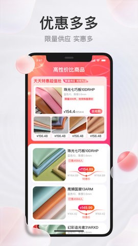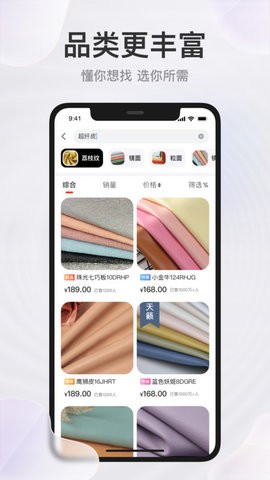 所有的订单都能自动记录,可随时查看,了解订单的最新运输动态,支持多种物流公司查询。支持用户在线将优质的产品进行分享,可一键分享给亲友一起购物,还能生成精美的商品海报。用户可一键发布需求、定制开发、采购发布、生成供应、集中采购、本地服务等,操作简单快捷。在软件中可按用途、属性、图片、纹路查找产品,也可以单独或群发索样报价,非常方便,支持多种筛选条件。提供采购商个人的商铺商品收藏功能、个人需求、询价单、个人资料修改、客户中心服务,打造专属的采购空间。