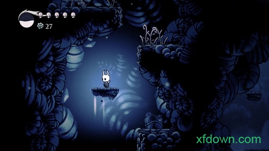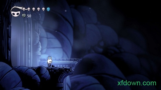 游戏中的生物群落简直超越了笔者的想象,而它们中的每一个,都会让神圣巢穴变得更加完整。例如,当你来到"真菌荒地(FungalWastes)"时,即便在那些无法通过的墙面上,也长满了该地区标志性的蘑菇。"苍绿之径(Greenpath)"则显得非常潮湿与葱郁,这也和冰冷黑暗的"遗忘十字路(ForgottenCrossroads)"形成了鲜明的对比。从严格意义上来说,"雾谷(FogCanyon)"并不是一张水下地图,但是它沉闷的配乐、水母外观的敌人、亮蓝色的画风,却能给人一种置身水底的错觉。