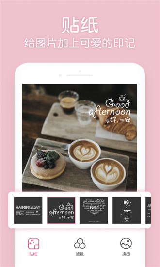 增加拍照构图功能,获取专业的摄角;新增的黄金分割线和三分法辅助线帮助您拍出更专业的照片。增加整理图片功能,高效的图片整理工具;支持智能分类和批量处理,让照片管理更轻松。增加贴纸功能,给你的图片加上可爱的印记;上百款动态和静态贴纸可选,为照片增添趣味元素。