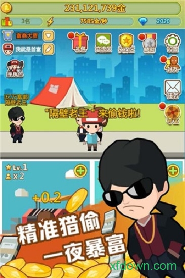 手上的钱不要存着你需要放出去然后帮你生钱比如先圈地,游戏引入动态经济系统,物价会随玩家行为波动;穷逆袭大翻身模拟养成游戏;白手起家经历磨难困难重重,新增突发事件系统考验玩家应变能力;投资、建设、买卖制作富翁计划;小偷、管家、保安三种身份三条致富路,每个身份都有专属剧情和特殊技能。灰色收入是必不可少的,偶尔的时候还是需要进行偷猎的,一夜暴富就这么简单,但要注意法律风险;有钱了生活质量必须得提升上来,挥金如土的日子就这么简单的开启了,豪华座驾、私人飞机等奢侈品系统满足玩家的成就感。