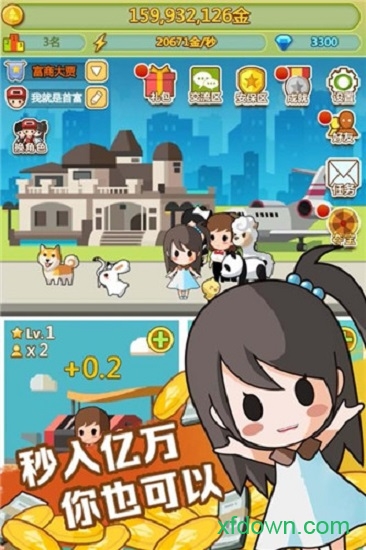 数量众多的萌宠豪宅等待主人的召唤哦!还有小偷,管家,保安,豪车等等丰富的游戏元素,快来试试看吧!成为世界首富!游戏中的每个NPC都有独立AI,会记住玩家的商业行为并做出相应反应。慢慢赚钱,开烧烤店,机械厂,到最后面的核电站!努力成为世界首富吧!新颖投资系统可以让你买下全国黄金地段!新增的环保系统要求玩家在盈利的同时也要注意企业社会责任。这画风是真的很搞笑啊,真实的人生经验,你们有莫有感同身受啊;无聊的时候玩一玩还是很有意思的,不用花费心思的趣味小游戏;赶紧与亲爱的小伙伴们一起来玩耍,畅享真实的人生创业经历.多人联机模式支持最多4人合作经营或竞争,大大延长了游戏寿命。