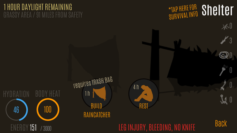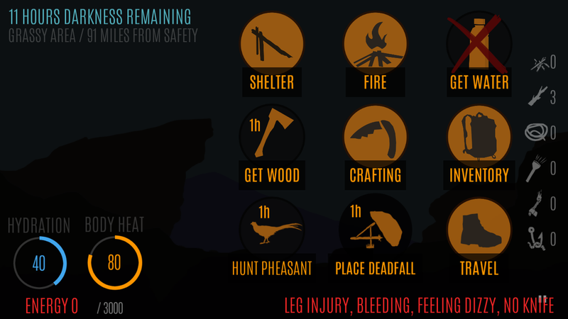玩家将扮演一名意外被困在荒野中的幸存者,必须运用有限的资源和工具在恶劣环境中挣扎求生。游戏的核心玩法围绕资源管理展开,你需要合理规划每天的生存计划:收集树枝搭建临时庇护所,寻找可食用的浆果和蘑菇,利用容器收集雨水,还要时刻注意保持体温。随着游戏进程,你会遭遇随机生成的突发事件,比如突如其来的暴风雨、狼群的夜间袭击,甚至是神秘的陌生人出现。这些动态事件让每次游戏体验都充满未知与挑战。