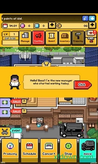 从小型娱乐机构开始不断经营壮大,每个月都培养出一位聚集人气的潮流偶像。经营系统包含财务管理、员工招聘、设备升级等多项内容。