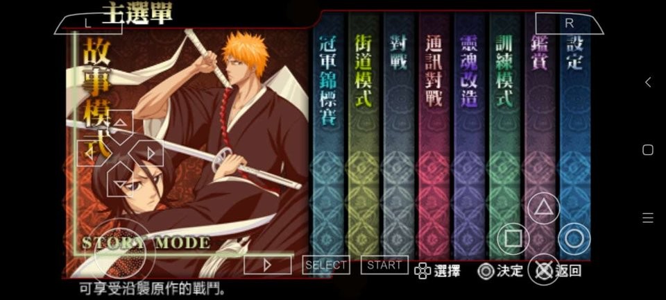 进入游戏-->按"START键"-->游戏封面按"START键"再按一次"START键"-->游戏主菜单界面,摇杆选择"故事模式"按○键-->出现"继续游戏""全新游戏"摇杆选择"全新游戏"按○键-->出现"死神代行篇"按○键,再按一次○键-->出现"Start""Story"摇杆选择"Start"按○键即可开始游戏。游戏还支持自定义按键布局,玩家可以根据操作习惯调整按键位置。