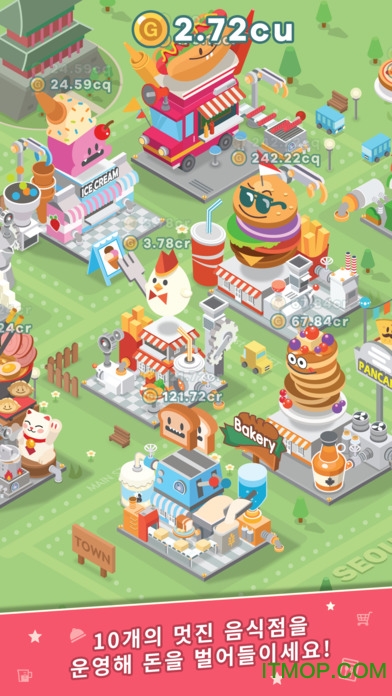 这款游戏完美诠释了"轻松治愈"的定义!完全不必担心语言障碍问题,简洁直观的操作界面让任何人都能快速上手。游戏中那些在建筑上蹦蹦跳跳的食物形象简直萌化人心,搭配轻快的背景音乐,让人玩着玩着就会不自觉地露出微笑。游戏采用了智能化的放置系统,当建筑升级到特定等级后,金币收集就会自动完成。但要注意,除了升级建筑外,提升食物利润也同样重要。游戏拥有超长的养成线,建筑最高可升至上千级,每个建筑都有8个成长阶段,每次进阶都会带来全新的外观变化。最令人惊喜的是,小镇左下角会随机出现弹吉他的NPC,通过快速点击可以获得丰厚奖励,为游戏增添了更多互动乐趣。
