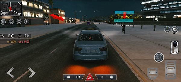 选定操作模式后,就可以开始驾驶出租车了。首先需要启动车辆,点击屏幕右侧的红色点火按钮,然后长按黑色启动键,当车灯亮起时表示车辆已成功发动。屏幕左下角的虚拟方向盘用于控制车辆方向,右侧则分布着油门、刹车和档位控制按钮。游戏会通过箭头指引玩家前往指定地点接载乘客,接到乘客后,按照红色箭头的导航路线将乘客安全送达目的地,即可完成任务获得奖励。