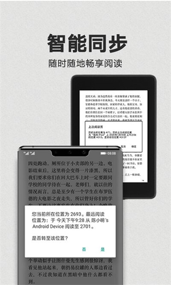 在安装了Kindlel的PC,Mac,iPad,iPhone,iPodTouch,安卓手机与平板电脑间自动同步图书馆内容、阅读进度、笔记、标注、书签。同步过程快速稳定,确保用户在任何设备上都能从上次中断的地方继续阅读,实现真正的跨平台无缝体验。
