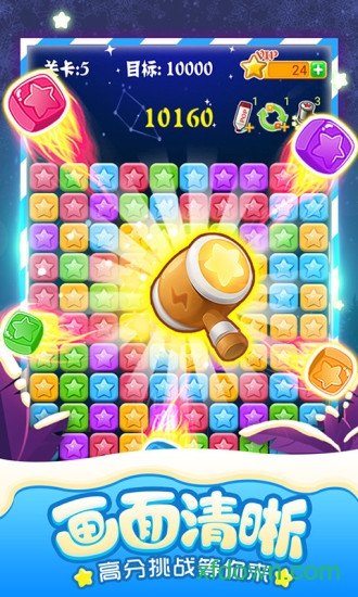 【画面清新】采用清新亮丽的面板设计,配合酷炫的游戏特效和梦幻的星空场景,带你畅游在神奇的星星消除世界中。