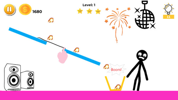 游戏的操作方式非常简单直观,采用触屏控制让所有玩家都能轻松上手。游戏画面采用了明亮活泼的卡通风格,各种夸张的爆炸效果和火柴人搞笑的反应让人忍俊不禁。游戏内设置了大量实用道具,包括弹簧、传送门、加速器等,玩家需要合理运用这些道具来克服关卡中的障碍。核心玩法是画出合适的线条来引导爆炸,但要注意线条的绘制角度和长度都会影响最终效果。游戏还加入了物理模拟系统,让每一次爆炸都能产生真实的连锁反应,增加了游戏的可玩性和趣味性。