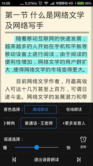 创新性的男女声智能朗读功能采用最新语音合成技术,发音自然流畅,支持语速调节和定时关闭,让您享受高品质的听书体验。
