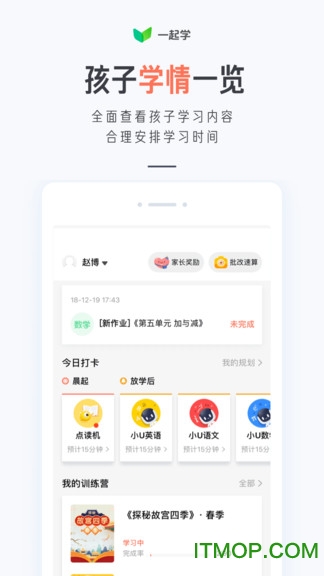 一起学(原家长通)由上海合煦信息科技有限公司精心打造,是一款专注于小学生家庭教育的智能应用。作为家长端专属软件,它不仅能实时追踪孩子在校的学习表现和考试成绩,更能通过AI智能分析精准定位孩子的知识薄弱点,并提供个性化的提升方案。软件内置的海量优质学习资源涵盖语文、数学、英语等多个学科,通过趣味化的学习形式激发孩子的求知欲,让家庭教育变得更加科学高效。家长还可以通过软件与老师保持密切沟通,共同关注孩子的成长轨迹。