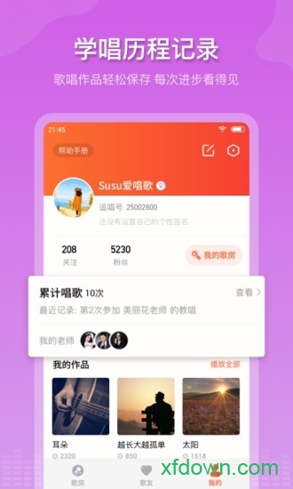 系统会自动记录你的每一次演唱,生成专属成长曲线。你可以随时查看自己的进步轨迹,见证从新手到歌手的蜕变过程。