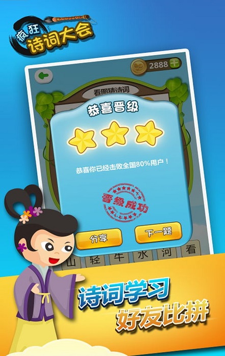 上千个精心设计的游戏关卡,从易到难循序渐进,既适合初学者入门,也能满足诗词高手的挑战需求。每道题目都配有详细的诗词解析、作者生平和创作背景介绍,让学习过程更加系统全面。游戏题库覆盖了人教版、苏教版等主流教材的全部古诗词内容,并额外收录了《唐诗三百首》《宋词三百首》中的经典篇目。创新的答题模式包括限时挑战、连对闯关、诗词填空等多种玩法,配合古典雅致的UI设计和悠扬的古琴配乐,营造出浓厚的文化氛围。游戏完美适配各类安卓设备,支持离线模式随时畅玩。