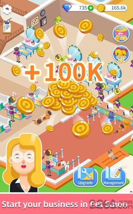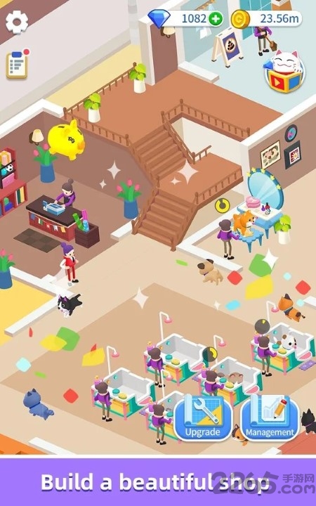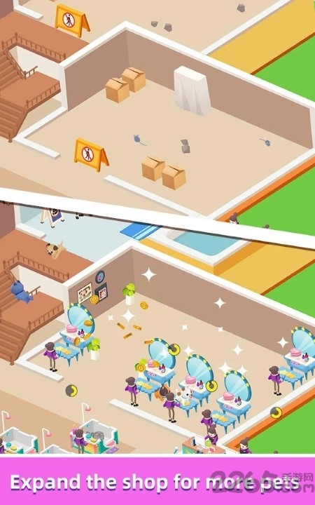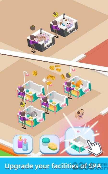 建立更多的设施并升级它们以赚更多的钱,包括美容台、洗浴池、SPA区等专业设备。