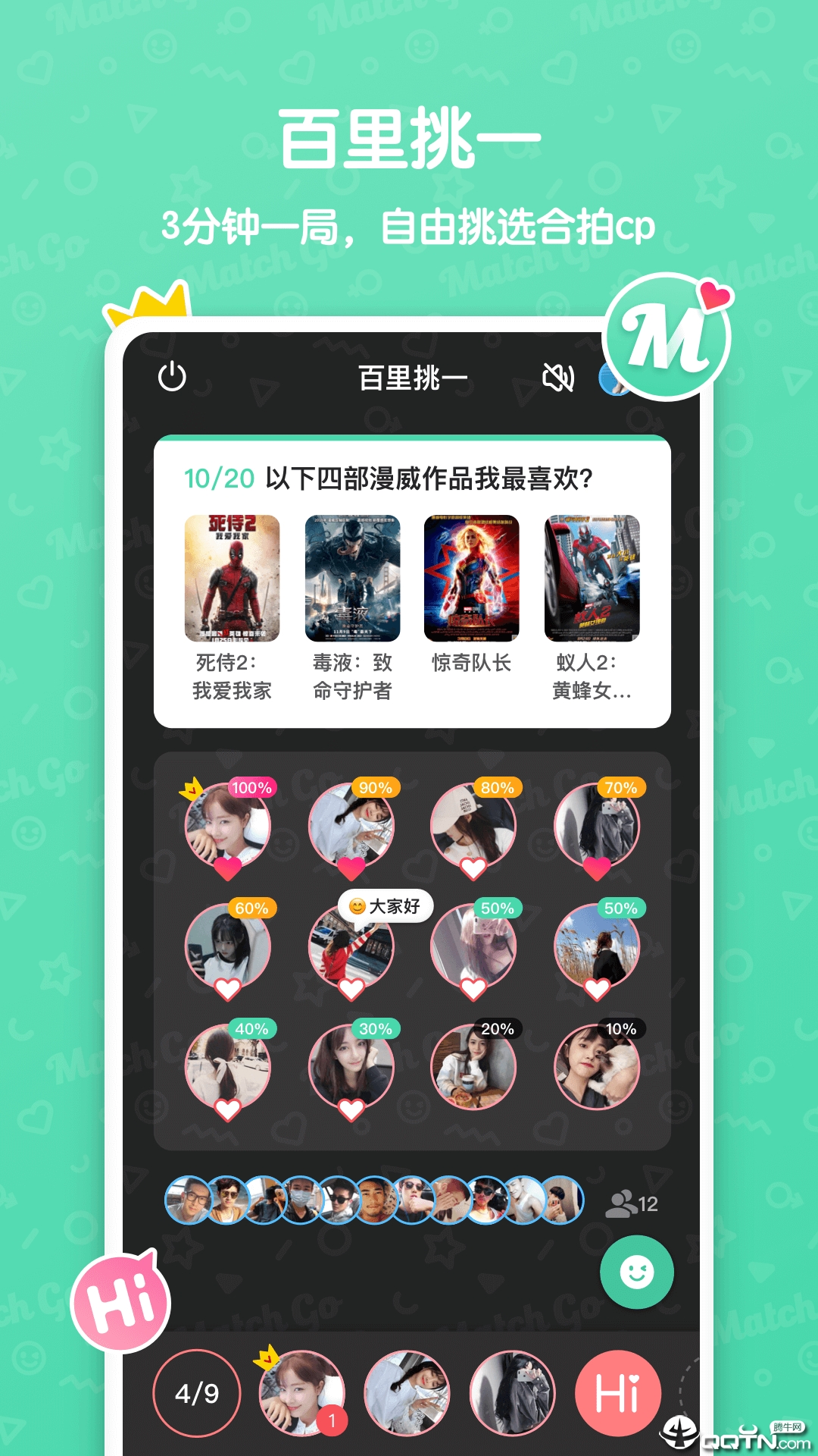 【百里挑一】这是MatchGoapp最具特色的社交模式。每局游戏仅需3分钟,系统会智能匹配12位男生和12位女生同场互动。通过分析用户的三观、兴趣爱好等多维度数据,平台会优先推荐匹配度最高的潜在对象。在这个轻松愉快的氛围中,你可以自由选择心仪的CP,开启一段奇妙的社交旅程。