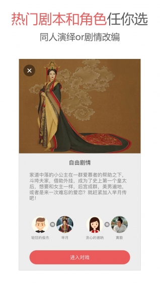 【游戏存储与分享】功能让精彩永不落幕,一键保存您的角色扮演作品,还能随时分享给好友或社区,让更多人感受您的创作热情。【可变脚本】系统赋予您编剧大权,支持自由改编经典剧情或原创全新故事线,真正实现"我的剧情我做主"。【任意角色】选择库收录了上百个经典动漫、影视角色形象,从日漫主角到美剧英雄应有尽有。【剧情导读】系统会根据您选择的角色智能推荐适配剧情,并提供专业的表演指导,再也不用担心冷场或接不上戏的尴尬情况。