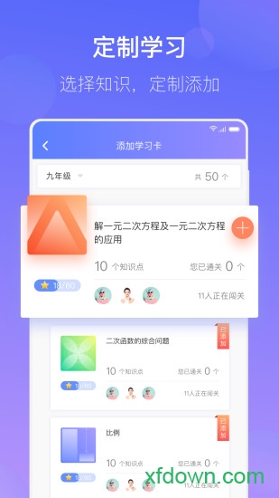 您可以添加需要使用的学习卡,然后可以每天在线学习。软件支持自定义学习卡片功能,学生可以标记重点难点,随时随地进行复习巩固。