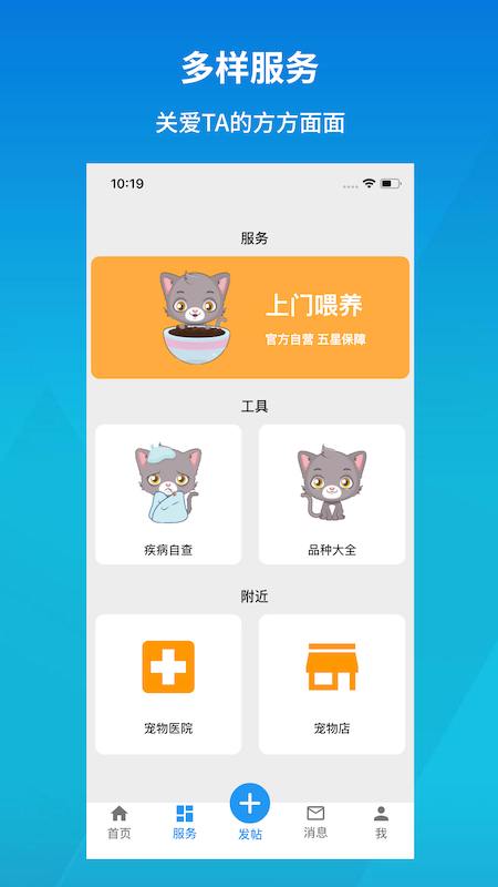猫村提供多项实用服务功能:疾病自诊工具可以帮助铲屎官初步判断猫咪健康状况;品种大全收录了各类猫咪的详细介绍;附近功能可以快速查找周边的宠物店、宠物医院;宠物市场则提供各类宠物用品的交易平台。