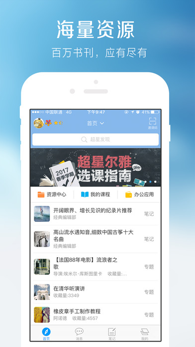 面向智能手机、平板电脑等移动终端的移动学习专业平台,随时随地都能学习。用户可以在超星客户端上自助完成图书馆藏书借阅查询、电子资源搜索下载、图书馆最新资讯浏览,操作便捷高效。学习学校专业课程,进行小组讨论,查看本校通讯录,同时拥有超过百万册电子图书,资源丰富多样。海量报纸文章以及中外文献元数据,为用户提供方便快捷的移动学习服务,满足不同层次的学习需求。