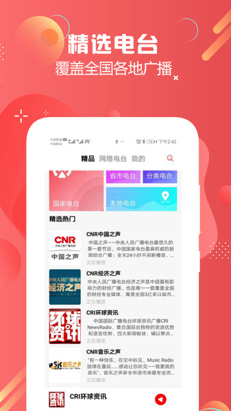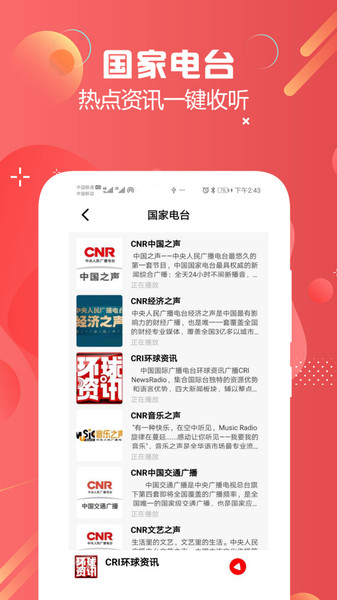支持即点即播,无需等待缓冲,超多网络电台节目任您选择,让您随时随地享受广播的乐趣;