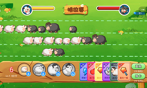 在闯关模式中,当敌方黑羊出现时,玩家需要将白羊拖动到对应跑道进行防御。通过力量比拼将敌方羊压制后退是取胜的关键。在势均力敌的情况下,合理使用道具可以扭转战局。