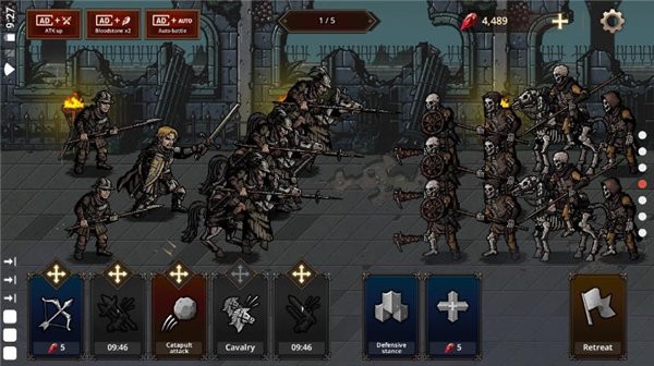 游戏采用直观的拖拽操作方式,长按兵力卡片即可召唤部队,每个兵种最多可同时召唤3个单位。召唤数量会影响冷却时间和血石消耗,合理规划兵力部署是取胜关键。召唤的部队既可用于防守基地,也能主动出击攻击敌人。在军营预先补充兵力可以缩短战场上的召唤时间,且不消耗珍贵血石资源。骑士团长每30秒可使用一次强力投石器攻击,这是扭转战局的重要技能。