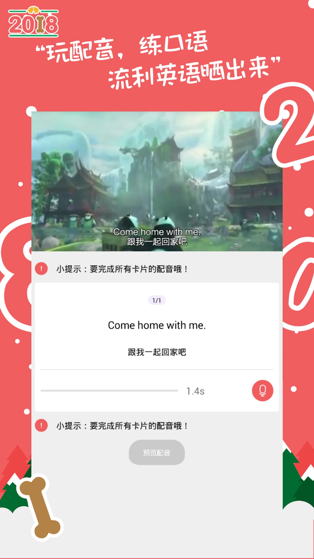 通过对电影动画等视频进行配音,充分满足小学生的好奇心和成就感。小猪佩奇、小黄人、冰雪女王、大白、、小马宝莉、芭比形金刚等英文电影片段边看边学,让语言回归生活和应用。每周更新热门动画资源,保持内容新鲜度,目前已收录超过500个配音片段。