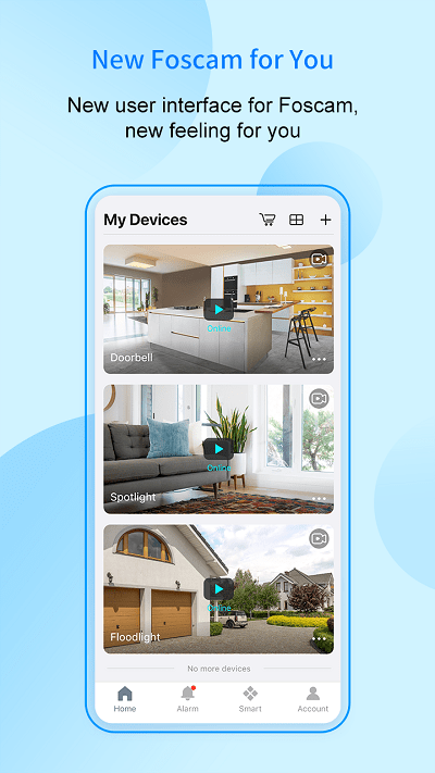 Foscam团队经过精心研发,对软件进行了全面升级,重新设计了用户界面和系统架构,带来更加清爽流畅的操作体验。通过这款手机客户端,您可以轻松添加新购买的Foscam设备,随时随地查看监控画面,接收实时报警信息,还能远程调整摄像机参数。Foscam云服务的加入让您的设备管理更加便捷,所有添加的设备和设置都会自动同步到云端。这意味着即使您更换手机或重新安装APP,所有设备信息都会完整保留,无需重复设置。Foscam团队将持续基于云平台开发更多实用功能,为用户带来更智能、更安全的监控体验。