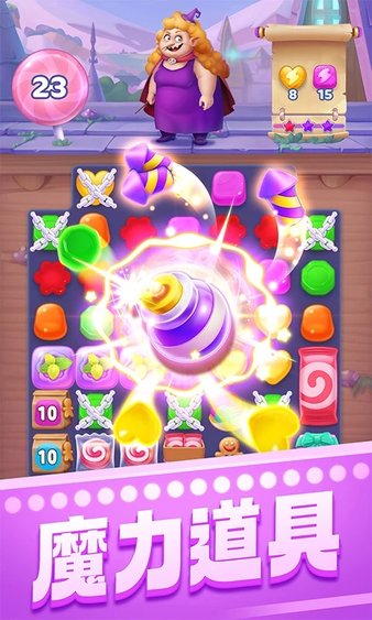 三位性格迥异的女巫为游戏增添了更多挑战性,她们会施展各种魔法干扰您的消除计划:有的会召唤难缠的小怪兽,有的会制造坚不可摧的硬糖障碍,还有的会让部分糖果陷入冰冻状态。面对这些捣蛋的女巫,玩家需要快速思考、灵活应对,运用各种特殊道具和连击技巧来化解危机。
