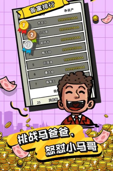 从日常的收益开始不断积累财富,成为首富之后依旧要经营产业才能让手中的金钱继续增长。游戏设计了完善的通货膨胀系统,迫使玩家不断寻找新的投资机会来维持财富地位。