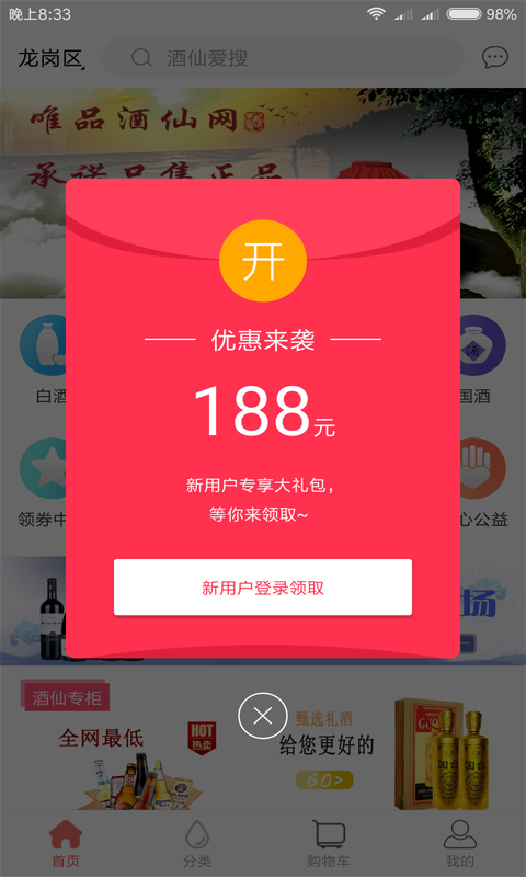 4、一键选酒:热卖好酒、名优白酒、红酒直采、喜宴用酒。