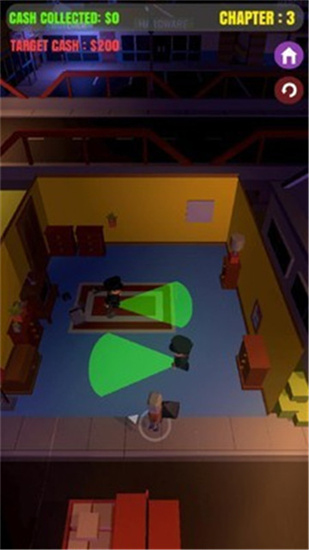 游戏采用立体3D场景设计,每个细节都经过精心打磨,让玩家仿佛置身真实的盗窃现场。警察AI系统非常智能,他们会按照固定路线巡逻,但只要不被发现就不会主动出击。玩家可以巧妙利用房间内的各种物品作为掩体,这些障碍物能够有效阻挡巡逻人员的手电筒光线,为你的行动提供掩护。