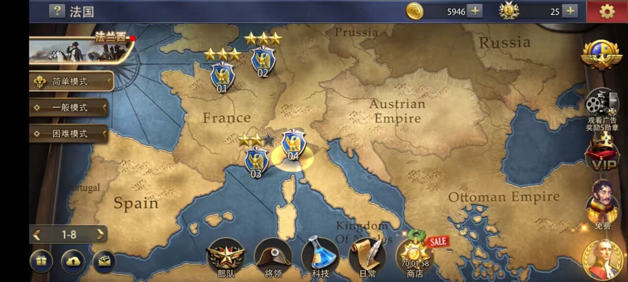 在大战争欧洲征服者的宏大世界观中,您将扮演一位运筹帷幄的军事领袖。游戏精心设计了上百个基于真实历史事件的战略目标,从维也纳会议到滑铁卢战役,每个决策都将影响欧洲大陆的命运版图。您既可以遵循系统提供的战略指引稳步发展,也能自由探索独创的征服路线。跨越阿尔卑斯山脉的急行军、多瑙河畔的围城战、伊比利亚半岛的游击战术——多样化的地形与天气系统将让每场战役都充满战术变数。