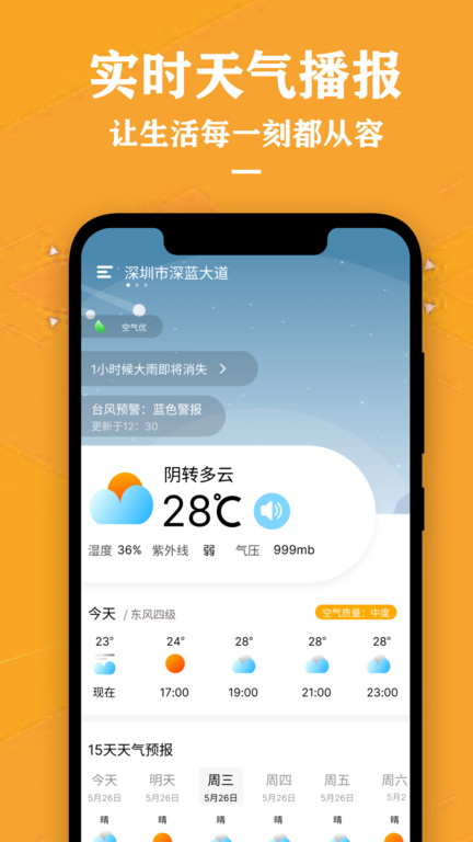 app不仅提供实时和未来15天的天气预报情况,还提供穿衣、紫外线、舒适度等生活指数,方便用户生活。